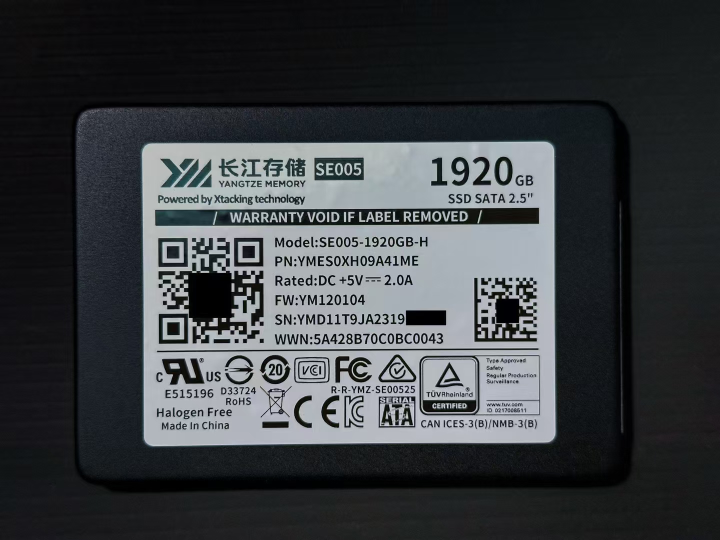 長江存儲企業級SATA SSD SE005容量點為240G~1.92T,尺寸2.5寸,順序讀寫分別高達540/510 MB/s,隨機讀寫分別高達98/59 KIOPS,小容量點適合作為服務器啟動盤使用。
